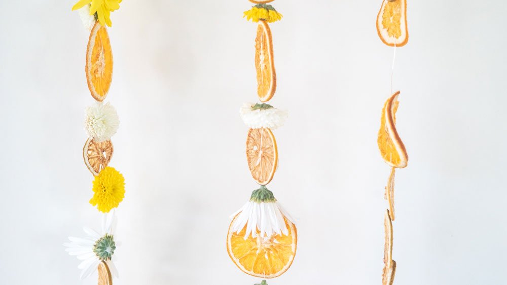 Adding flowers softens the look of the dried citrus garland and creates a cheerful color palette. But even a simple garland made with just dried lemon and orange slices looks lovely.